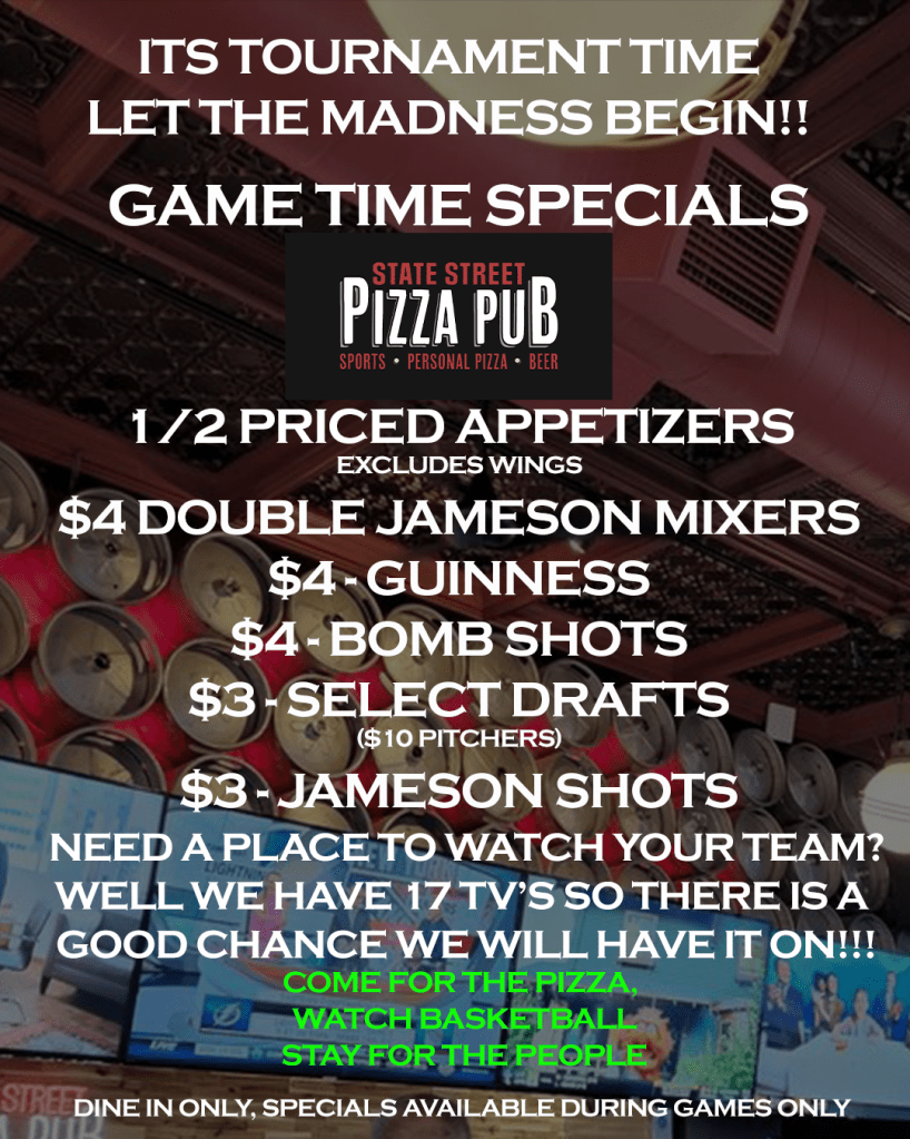 Do you have any plans to go to the game to cheer on your favorite team or just stay at home and watch them on your tv? If not how about going to the State Street Pizza Pubs in the heart of Milwaukee’s City Centre on State Street and watch the game on 17 tv’s also enjoy the pub’s game time specials. Like $4.00 Guinnis, ½ price appetizers, also $4.00 Bomb shots or enjoy amazing food from the menu like Pizza, Wings, and Sandwiches also beers on tap and sodas. So, what are you waiting for watch all the march madness tournaments at State Street Pizza Pub Located at 322 West State Street, Milwaukee, Wisconsin 53203 USA in Milwaukee’s City Centre a little east of The Milwaukee Area technical Collage on State Street.