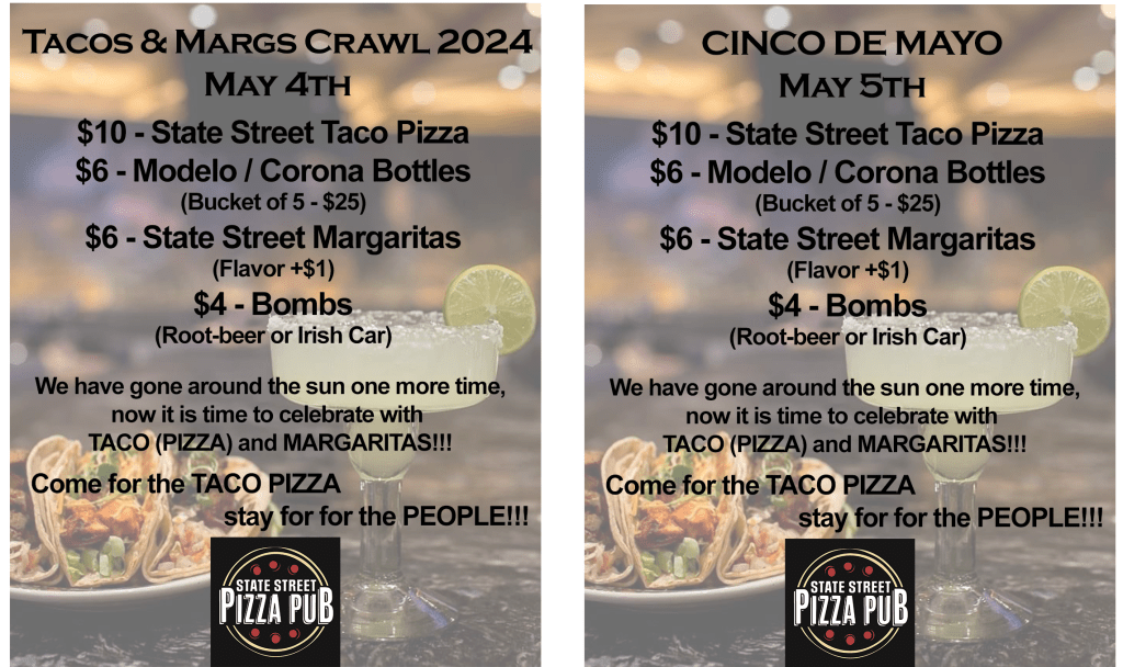 Looking something a place to celebrate Cinco De Mayo? Over the weekend then if so, The State Street Pizza Pub is the place to be at on Saturday the 4th of May and on Sunday the 5th of May they will be serving delicious homemade taco pizza on special for $10.00 Then wash it down with $6.00 Modelo Corona Bottles also $6.00 Margaritas the State Street Pizza Pub is located at 322 W State St, Milwaukee, WI 53203 right down the Street from the MATC State Street Campus in Milwaukee City Centre. The State Street Pizza pub opens at 11:00 am to 12:00 on Saturday and they open at 11:00 am to 8:00 pm on Sunday at 322 W State St, Milwaukee, WI 53203. Come on down to the State Street Pizza Pub for delicious food, good drinks and great people.
