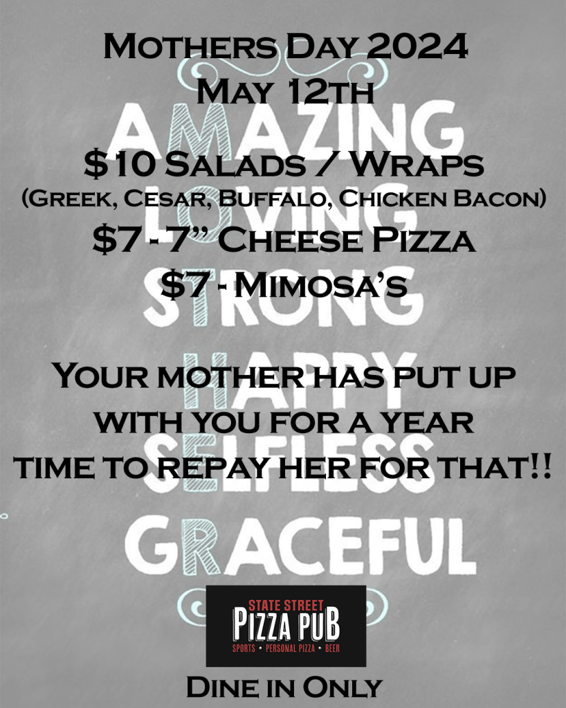 Mother’s Day is on The 12th of May are you thinking of what you can do for your Mum and what to give her. instead of a card and making her dinner let the State Street Pizza Pub do all the cooking for you so you and your Mum can relax and enjoy drinks, great Food and quality time. The State Street Pizza Pub will be serving up Mother’s Day specials.
